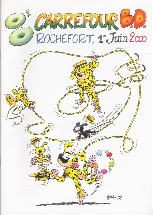 La famille Marsupilami, couverture originale à l’encre de chine et aux encres de couleurs réalisée pour le programme du festival BD de Rochefort en 2000. Dimensions : 42 cm x 29,5 cm.