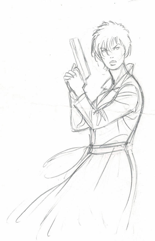 Pin-Up, dessin original à la mine de plomb (pli horizontal en travers du dessin). Dimensions : 29,5 cm x 21 cm.