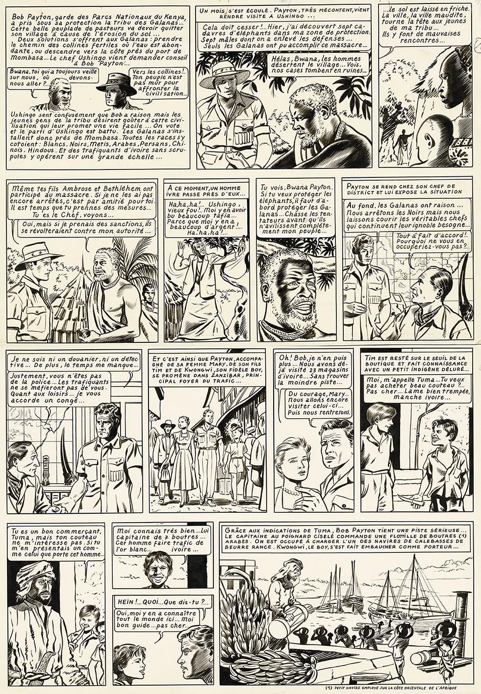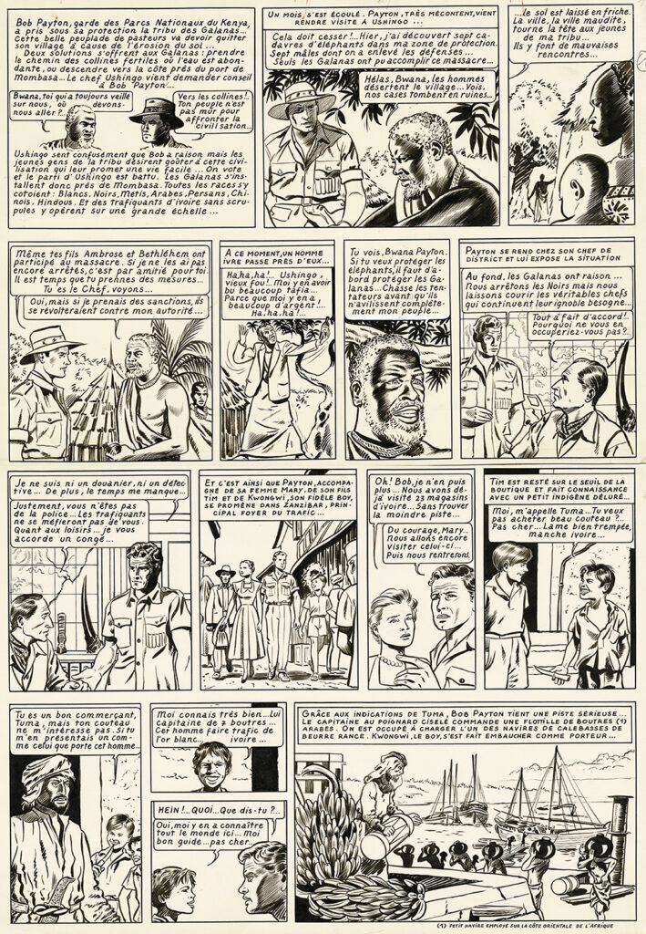 A l’ouest de Zanzibar, planche originale à l’encre de chine parue dans le journal Tintin en 1954. Dimensions : 65 cm x 47,5 cm.