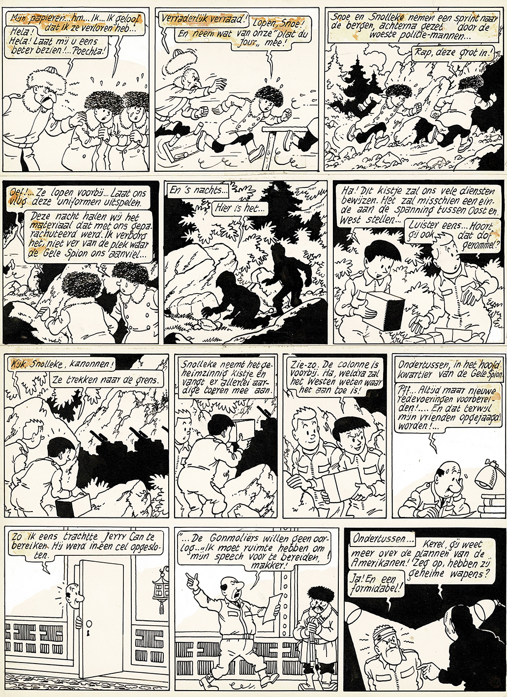 Johan et Stephan, L’espion jaune, planche originale à l’encre de chine. Dimensions : 40,5 cm x 30 cm.