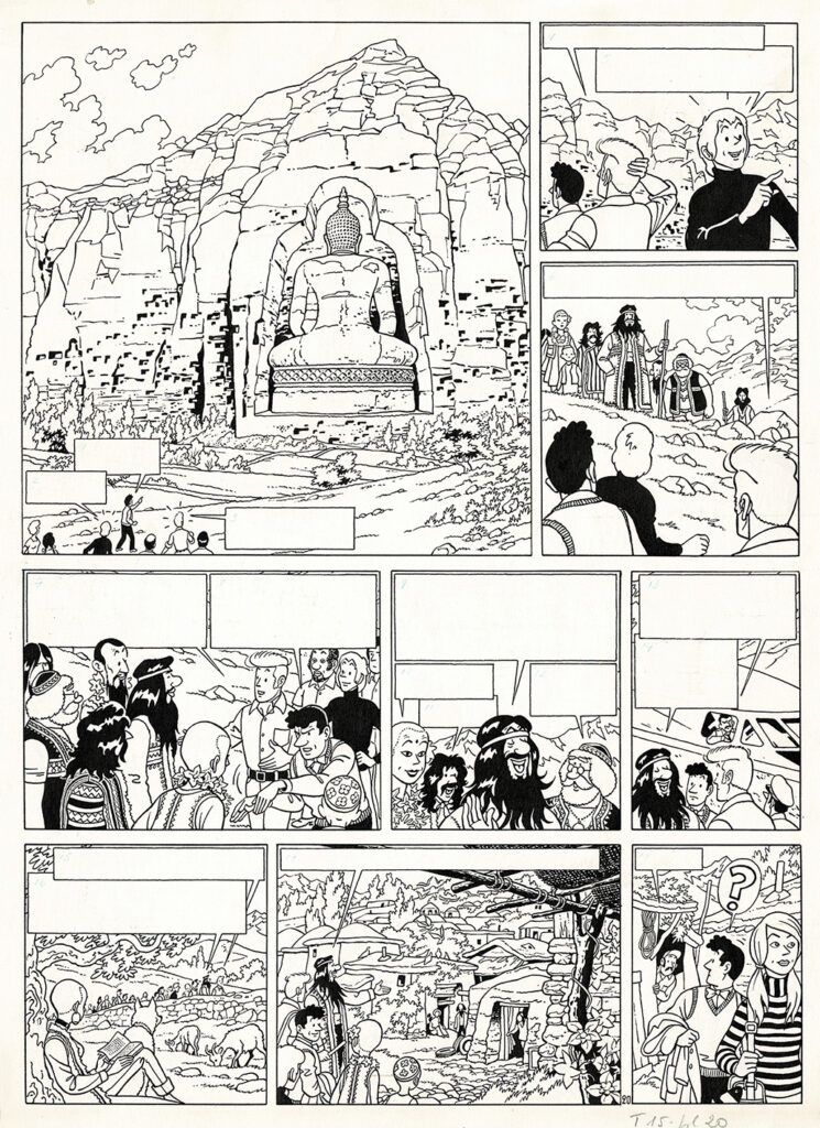 Barelli et le Bouddha boudant, planche originale à l’encre de chine pour cet album paru en 1974 chez Dargaud. Dimensions : 48,5 cm x 36,5 cm.