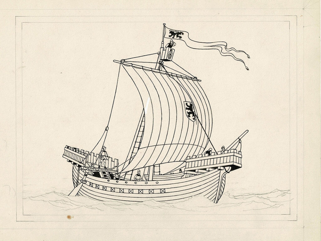La Marine de 1700 à 1850 (Voir et Savoir), dessin original à l’encre de chine pour un chromo. Dimensions : 33 cm x 23 cm.