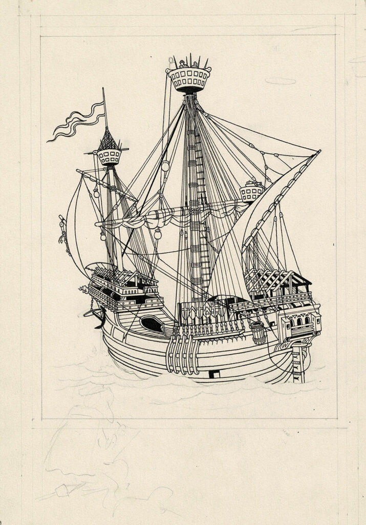 La Marine de 1700 à 1850 (Voir et Savoir), dessin original à l’encre de chine pour un chromo. Dimensions : 33 cm x 23 cm.