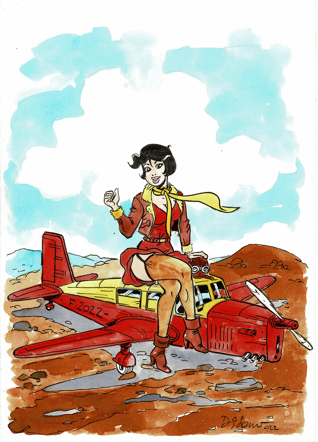 L’Aviatrice, dessin original à l’encre de chine et à l’aquarelle. Dimensions : 30 cm x 21 cm.