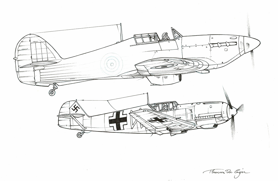 Hurricane Vs Messerschmidt, dessin original à l’encre de chine. Dimensions : 36 cm x 27 cm.