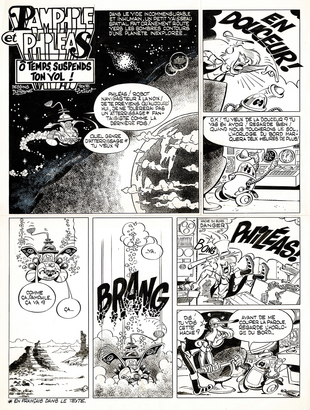Pamphile et Phileas, Ô temps, suspends ton vol !, planche originale à l’encre de chine. Dimensions : 50 cm x 38,5 cm.