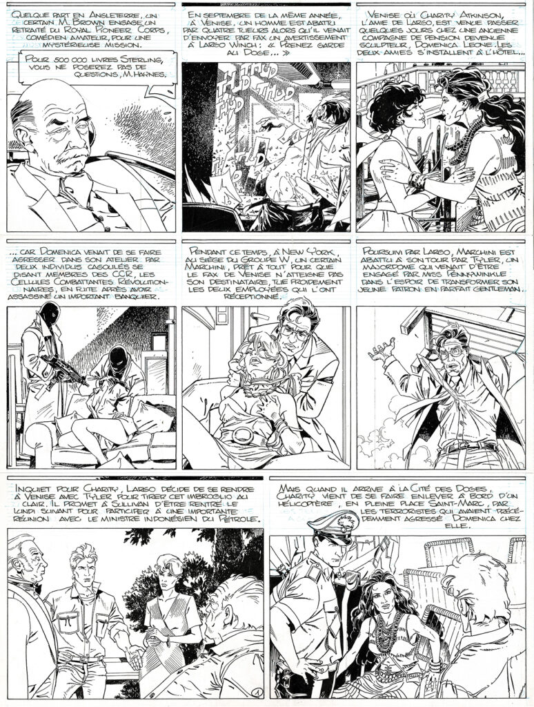 Largo Winch, …et mourir, planche originale à l’encre de chine pour cet album paru en 1999 chez Dupuis. Dimensions : 49,5 cm x 36,5 cm. Les cases 1, 2, 4, 6 et 8 sont des bromures.