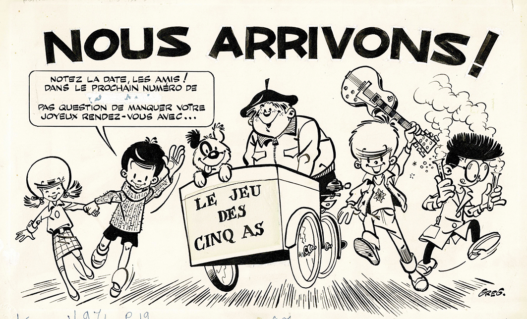 Les As, première apparition des As dans le journal Vaillant en 1963, dessin original à l’encre de chine. Dimensions : 32 cm x 19,5 cm.