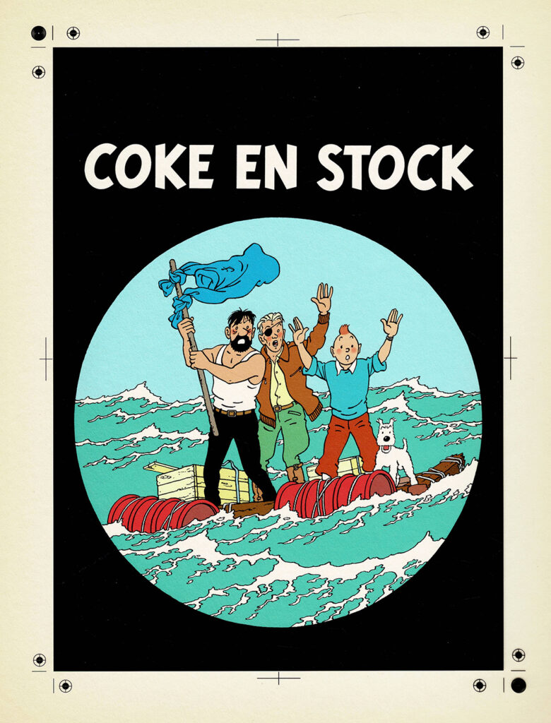 Tintin, Coke en stock, bleu de coloriage et son film noir pour la couverture de l’album. Dimensions : 41 cm x 32,5 cm.