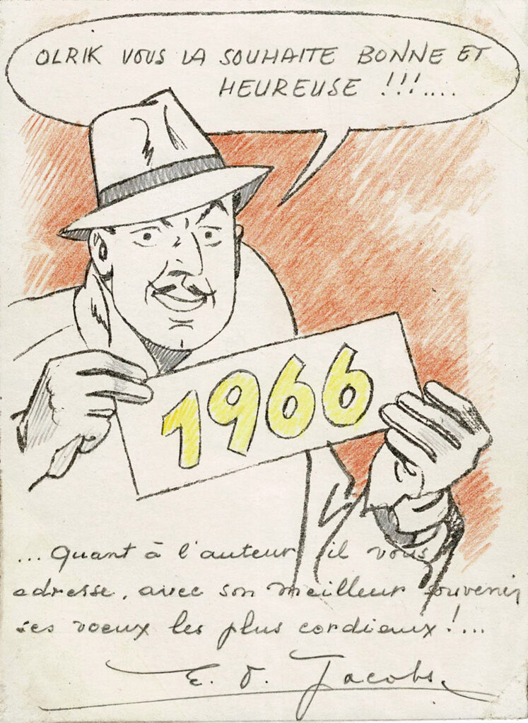 Blake et Mortimer, Olrik, dessin original à l’encre de chine et au crayon réalisé fin 1965 pour une carte de voeux adressée à Marcel Dehaye (rédacteur en chef du journal Tintin). Ce dessin a été publié en 1992 dans le Figaro, en écho à sa vente chez Neret-Minet à la même époque. Dimensions : 14,5 cm x 10,5 cm.