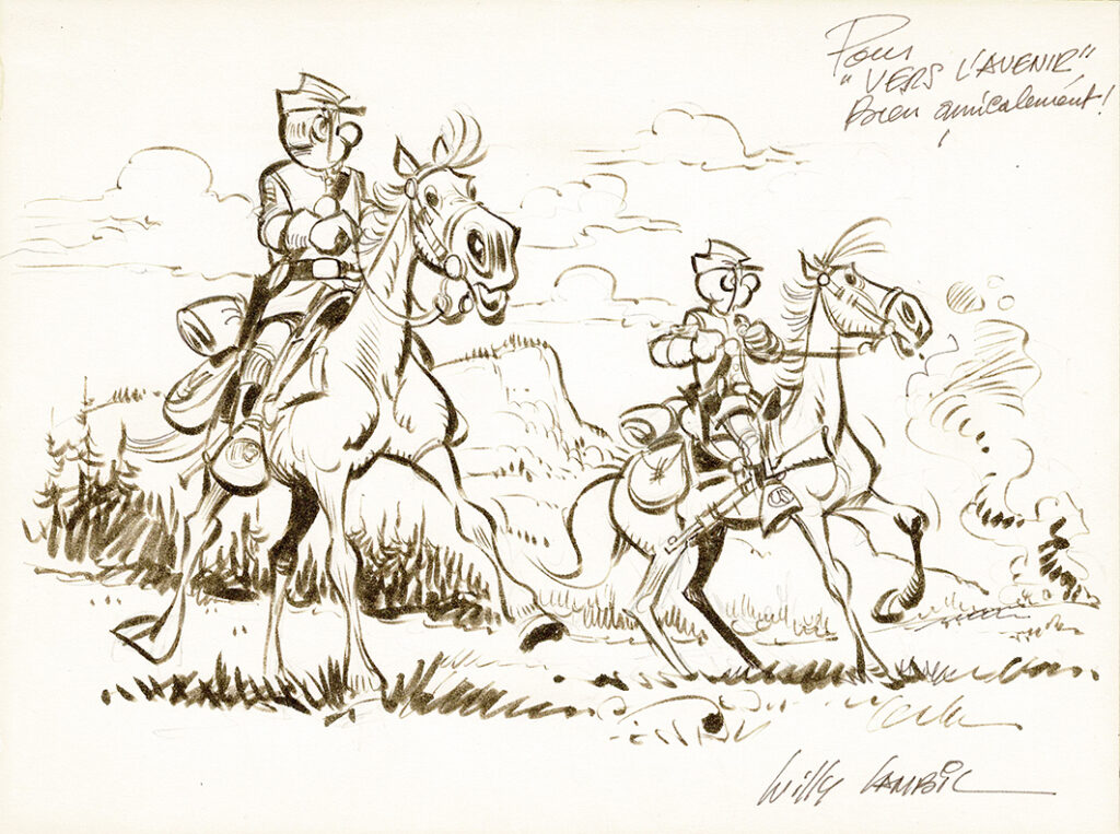 Les Tuniques Bleues, dessin original à l’encre de chine publié dans le journal « Vers l’Avenir ». Dimensions : 24 cm x 18 cm.