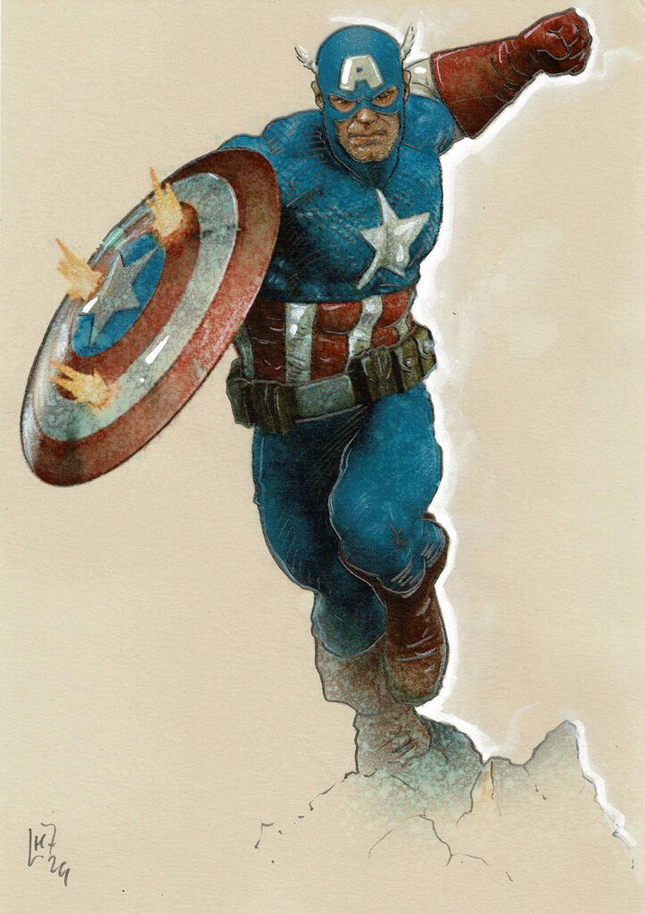 Captain America, dessin original en couleurs directes. Dimensions : 29,5 cm x 21 cm.