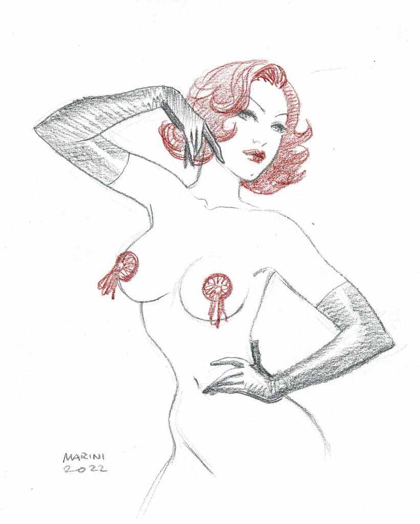 Noir Burlesque, dessin original à la mine de plomb et aux crayons de couleur. Dimensions : 26 cm x 21 cm.