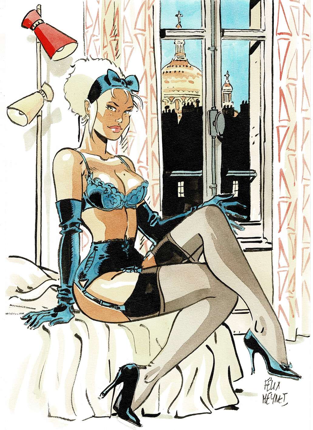 Pin-Up, dessin original à l’encre de chine et à l’aquarelle. Dimensions : 29,5 cm x 21 cm.