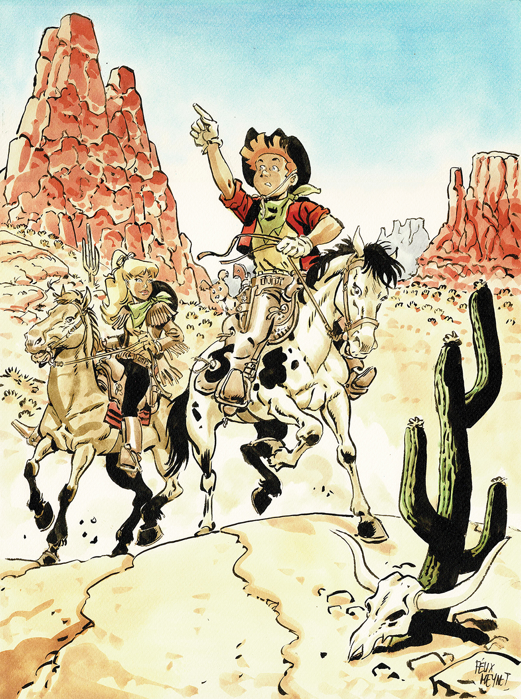 Spirou et Seccotine au Far-West, dessin original à l’encre de chine et à l’aquarelle. Dimensions : 40 cm x 30 cm.