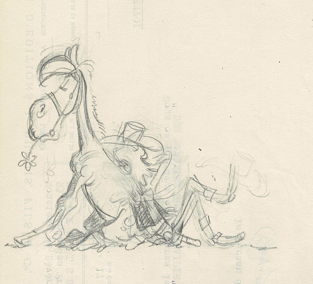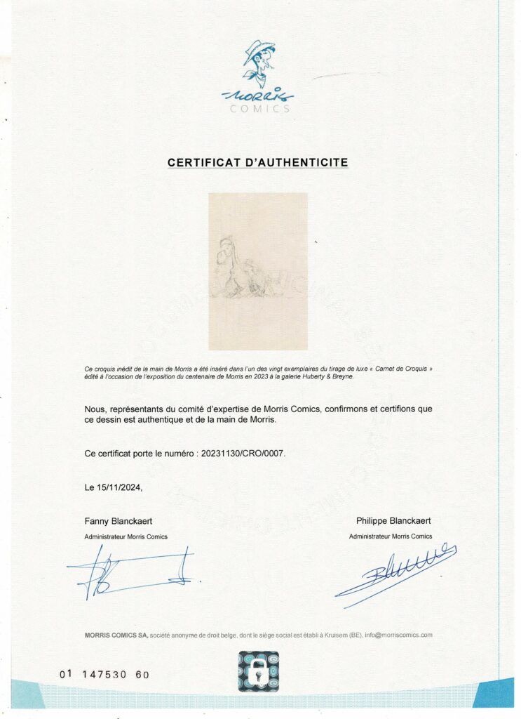 Lucky Luke, projet de couverture à la mine de plomb réalisé pour l’album « Aventures dans l’ouest » paru en 1989 chez Pocket BD. Dessin dans son coffret de luxe (Lucky Luke, Croquis inédits), limité à 20 exemplaires (édité par Huberty & Breyne). Dimensions du dessin : 21,5 cm x 13,5 cm. Coffret et album en état neuf. Accompagné de son certificat d’authenticité.