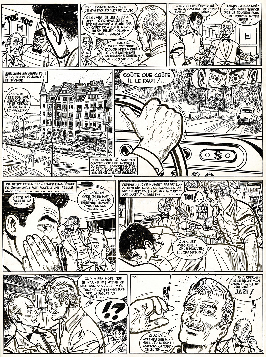 Jari et le Plan Z, planche originale à l’encre de chine pour cet album paru en 1964 au Lombard. Dimensions : 67,5 cm x 47,5 cm.
