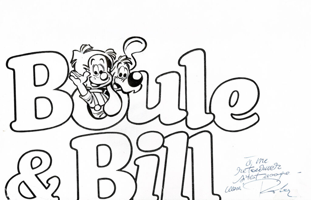 Boule et Bill, dessin original à l’encre de chine réalisé pour du merchandising, signé par Roba. Dimensions : 29,5 cm x 21 cm.