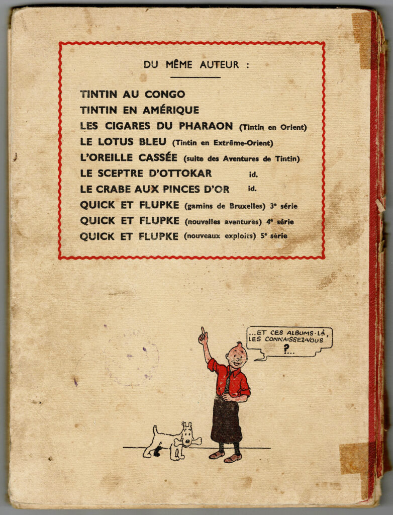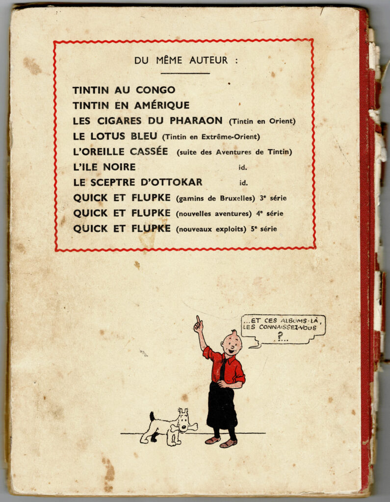 L’île Noire A17 1941 + Le Crabe aux Pinces d’Or A13 1941 (pinces vers le haut) + intérieur des Cigares du Pharaon Noir & Blanc. Ensemble de 3 noirs& blancs en état moyen, sauf l’intérieur des Cigares du Pharaon en très bon état.
