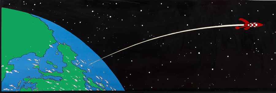 Tintin, plaque émaillée « Série lune » : La fusée quittant la terre (horizontale) n°/99, l’Emaillerie belge, 1985, n°61/150. Dimensions : 97 cm x 31 cm.