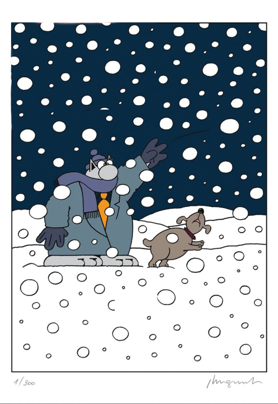Le Chat, Les boules de neige, sérigraphie limitée à 300 ex., signée. Dimensions : 80 cm x 60 cm.