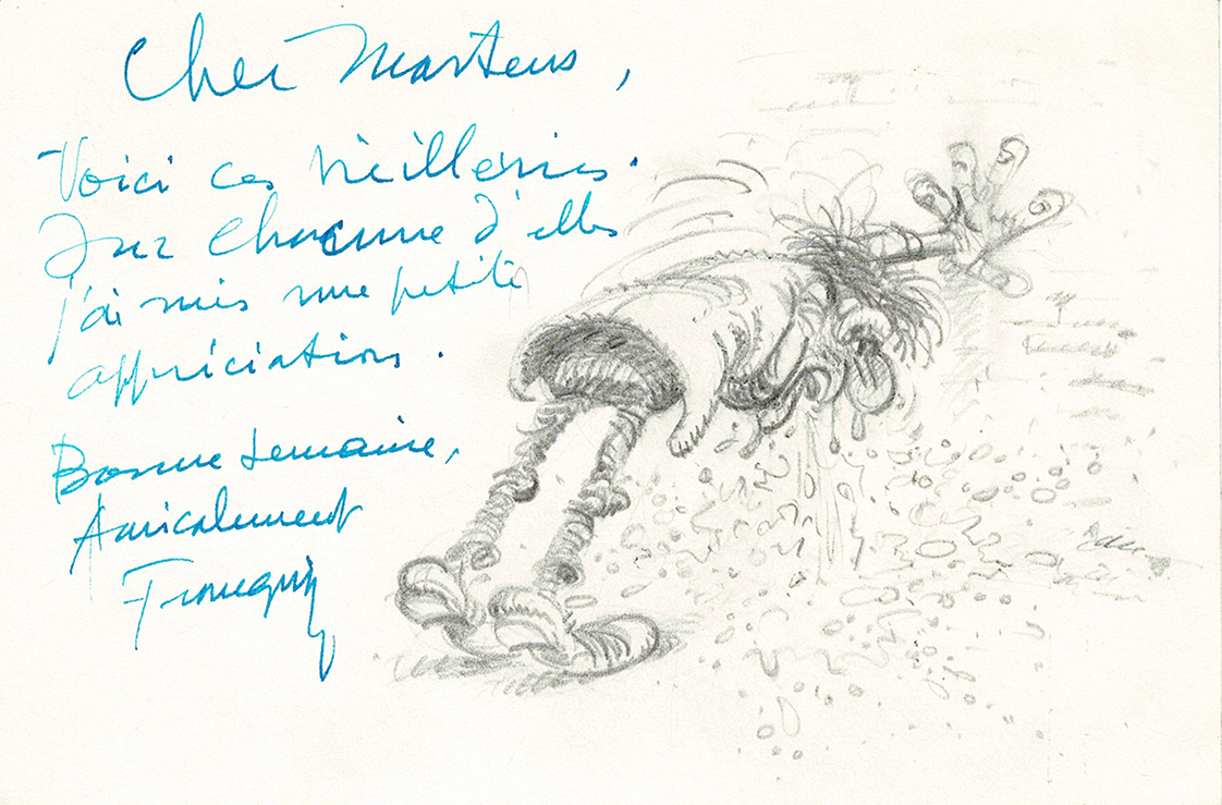 Dessin original à la mine de plomb offert à Thierry Martens. Dimensions : 15 cm x 10 cm.