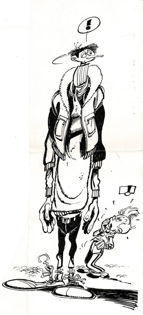 Spirou, dessin original à l’encre de chine offert à Thierry Martens (pli horizontal). Dimensions : 29 cm x 13 cm.