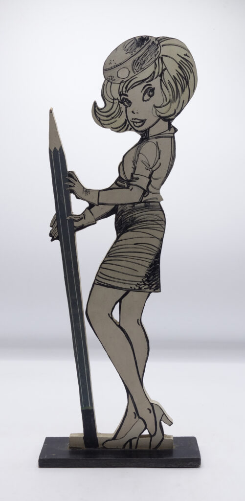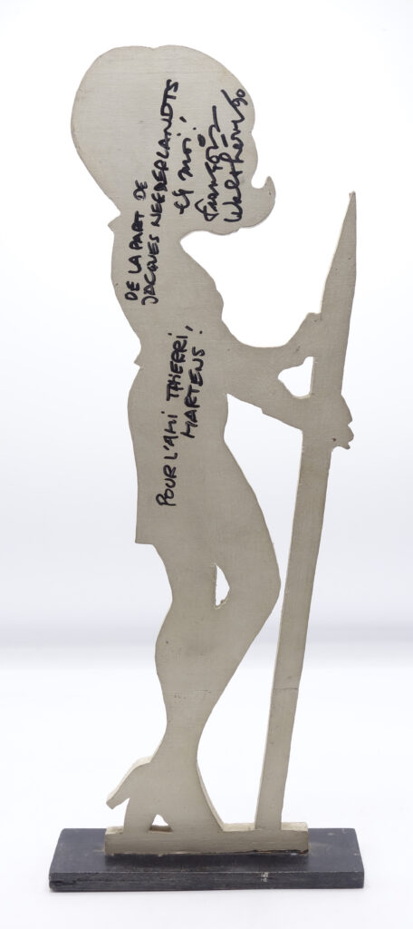 Natacha, silhouette en bois dessinée au feutre fin par Walthéry et offerte à Thierry Martens, signée au verso par Walthéry et par son concepteur. Hauteur : 46 cm. Pièce unique !