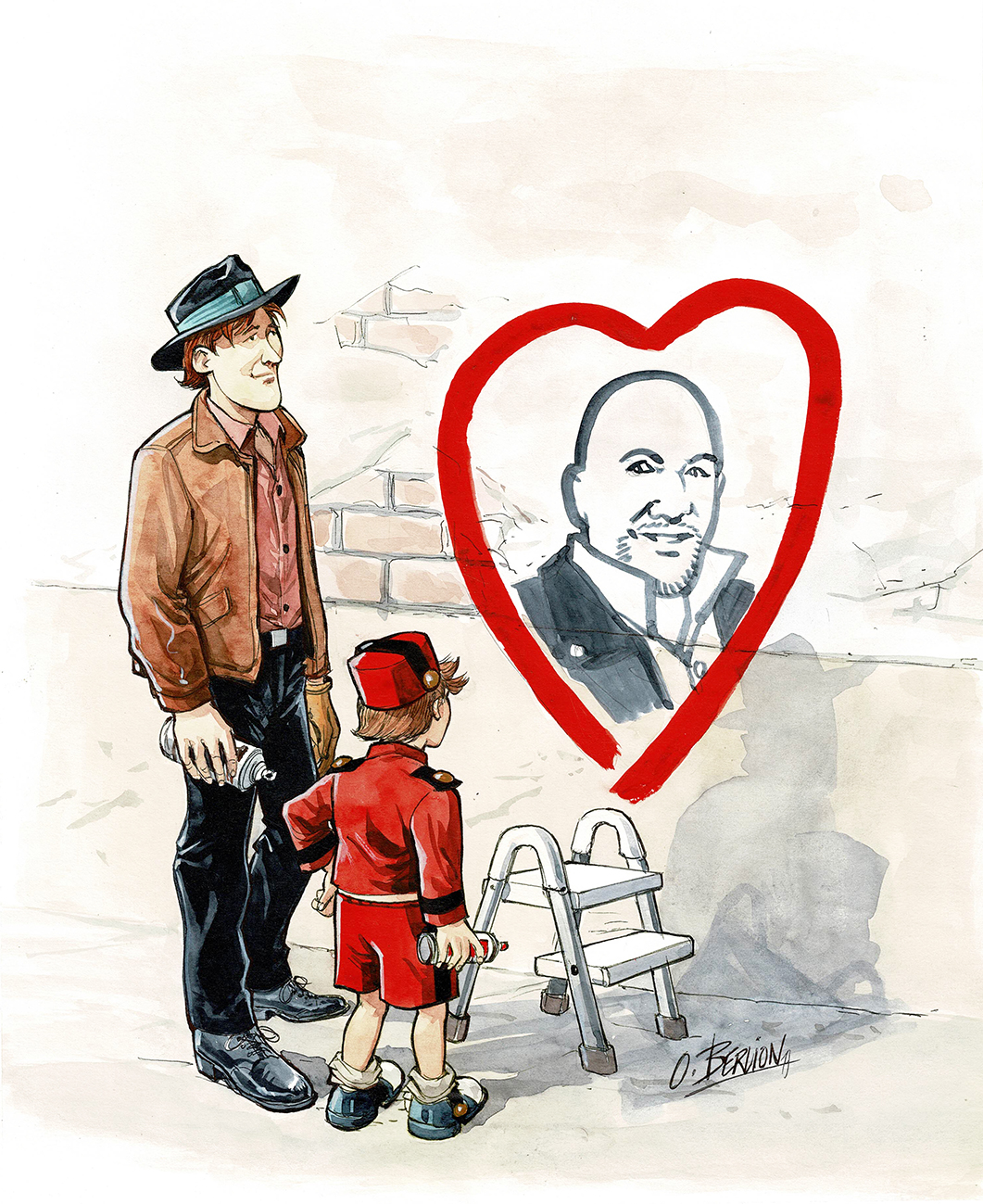 Le Petit Spirou, dessin original à l’encre de chine et à l’aquarelle en hommage à Tome. Dimensions : 33,5 cm x 25 cm.