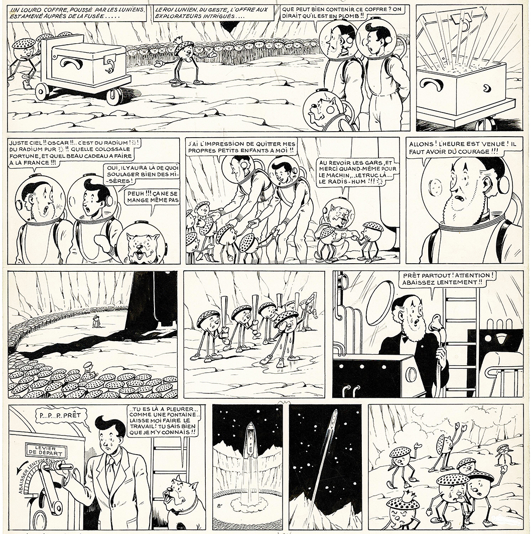 Oscar Hamel et Isidore, Les conquérants de l’infini, planche originale à l’encre de chine. Dimensions : 31,5 cm x 25 cm.