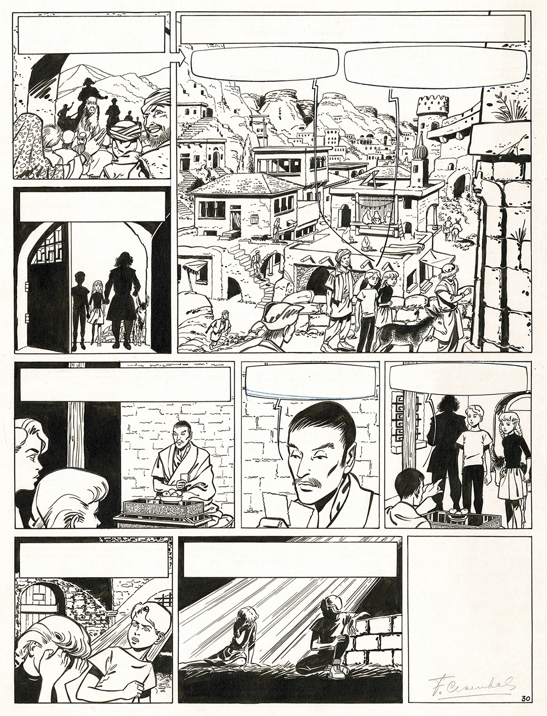 Pom et Teddy, Le Léopard des neiges, planche originale à l’encre de chine pour cet album paru en 1963 au Lombard. Dimensions : 51 cm x 34,5 cm.