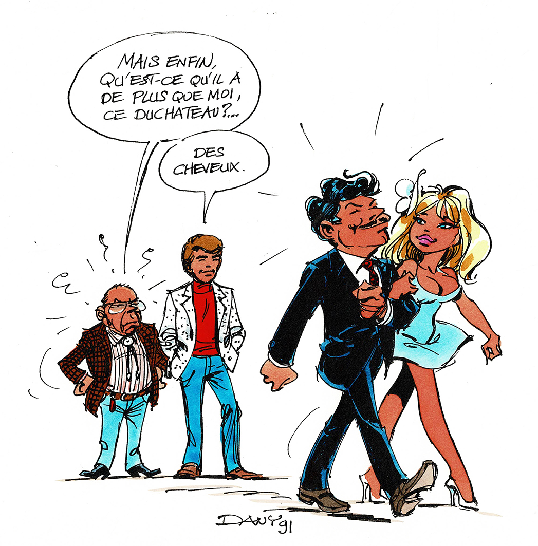 Olivier Rameau, dessin original à l’encre de chine et à l’aquarelle en hommage à Tibet et Duchateau. Dimensions : 28 cm x 21 cm.