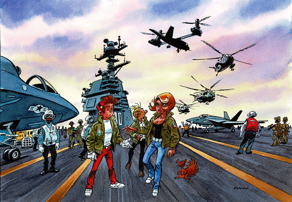 Spirou et la Gorgone bleue, dessin original à l’encre de chine et à l’aquarelle publié en double page dans le tirage de tête de cet album. Dimensions : 34 cm x 24 cm.