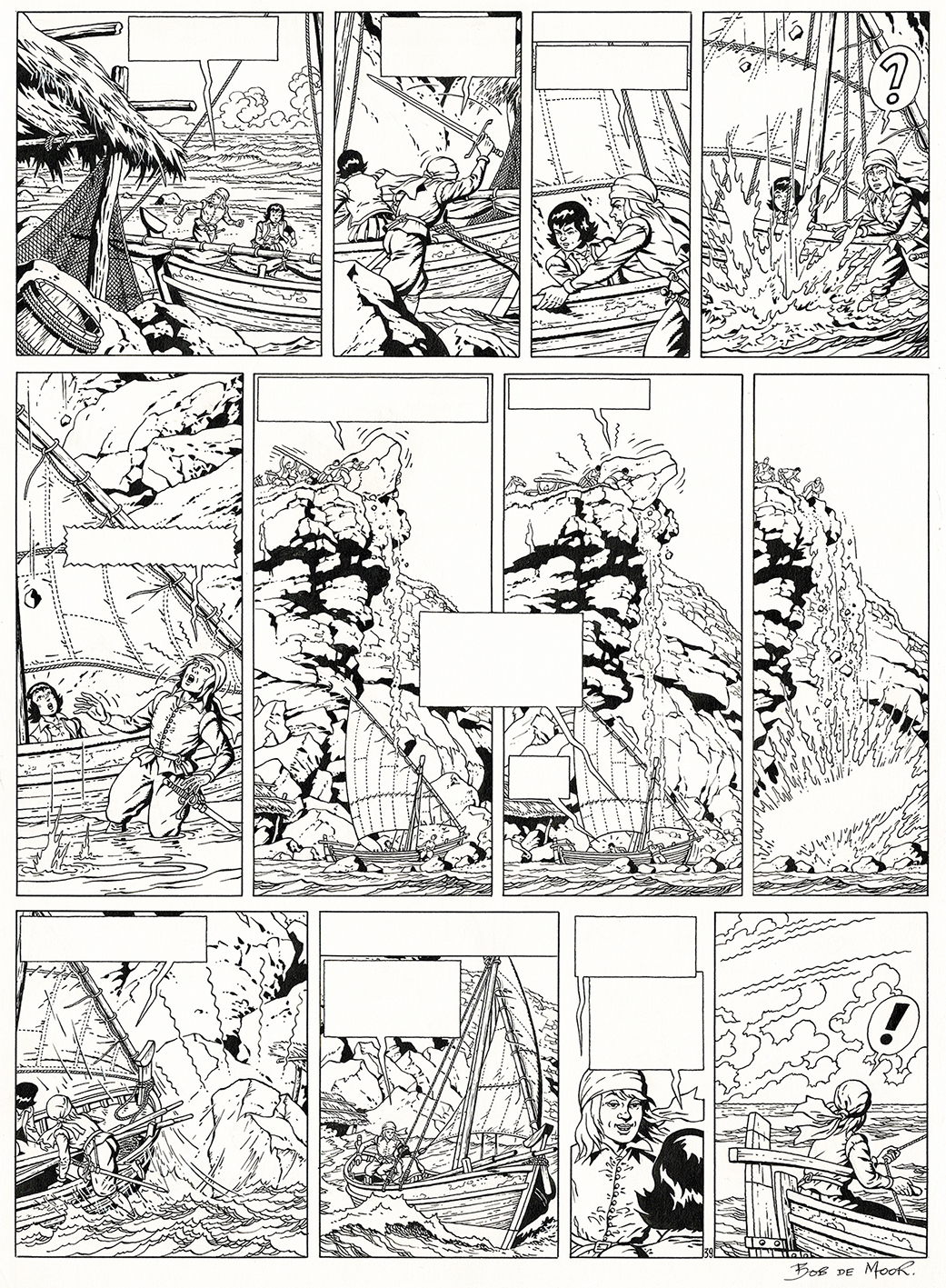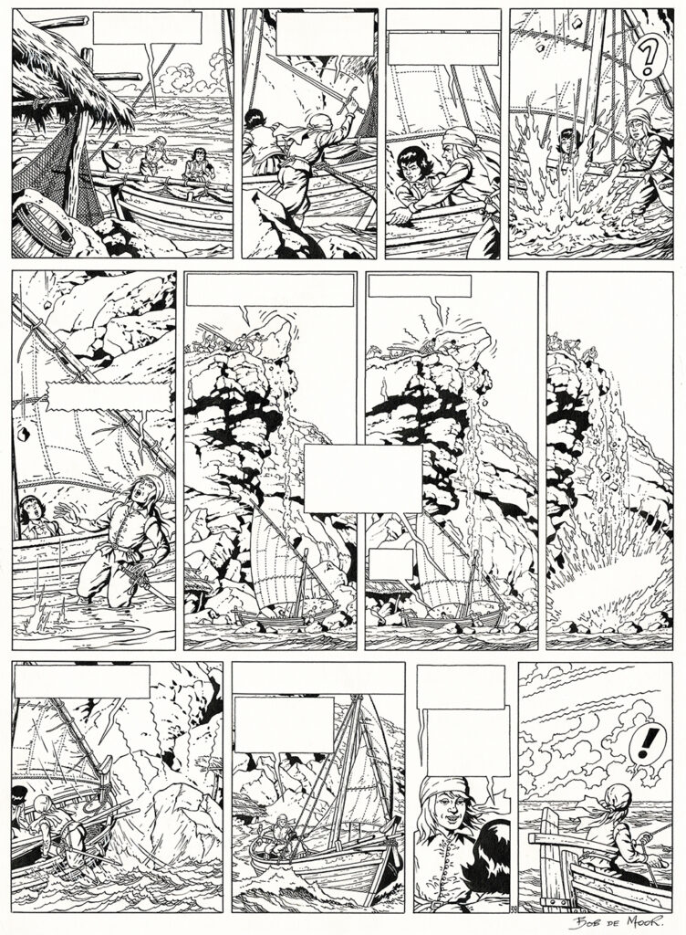Cori le Moussaillon, L’invincible Armada, Les espions de la Reine, planche originale à l’encre de chine pour cet album paru en 1978 chez Casterman. Dimensions : 49,5 cm x 36,5 cm.