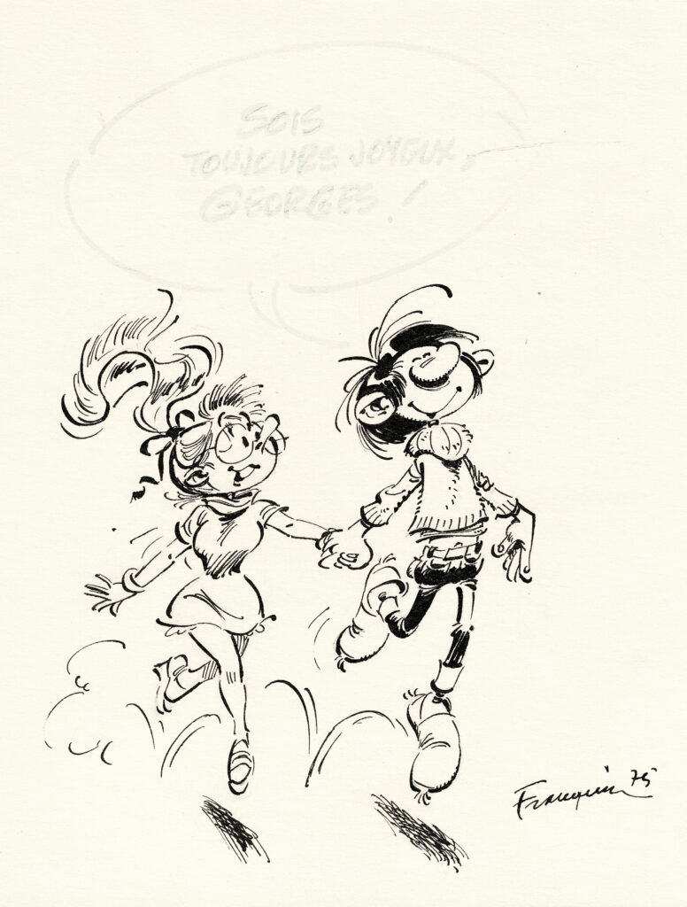 Gaston et Mademoiselle Jeanne, dessin original à l’encre de chine. Dimensions : 20 cm x 18 cm.