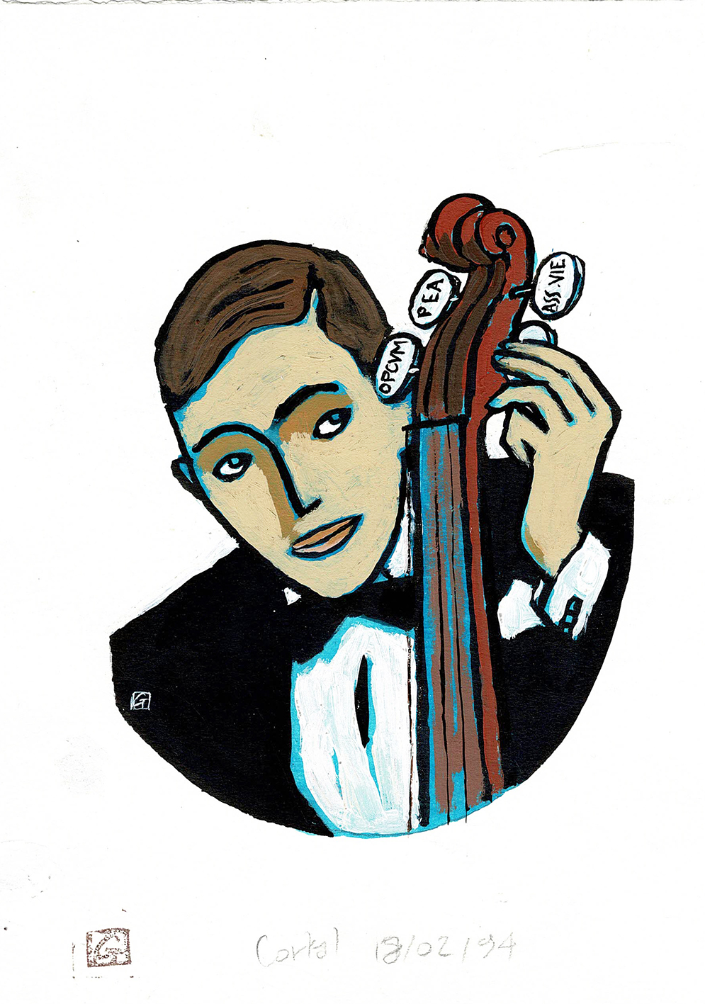 Le violoncelliste, dessin original à la gouache. Dimensions : 22 cm x 20 cm.