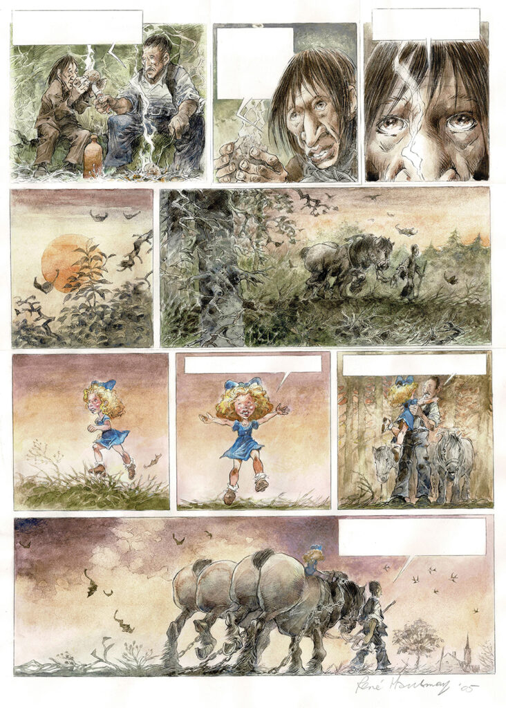 Le Camp-volant, planche originale à l’aquarelle. Dimensions : 51 cm x 35,5 cm.
