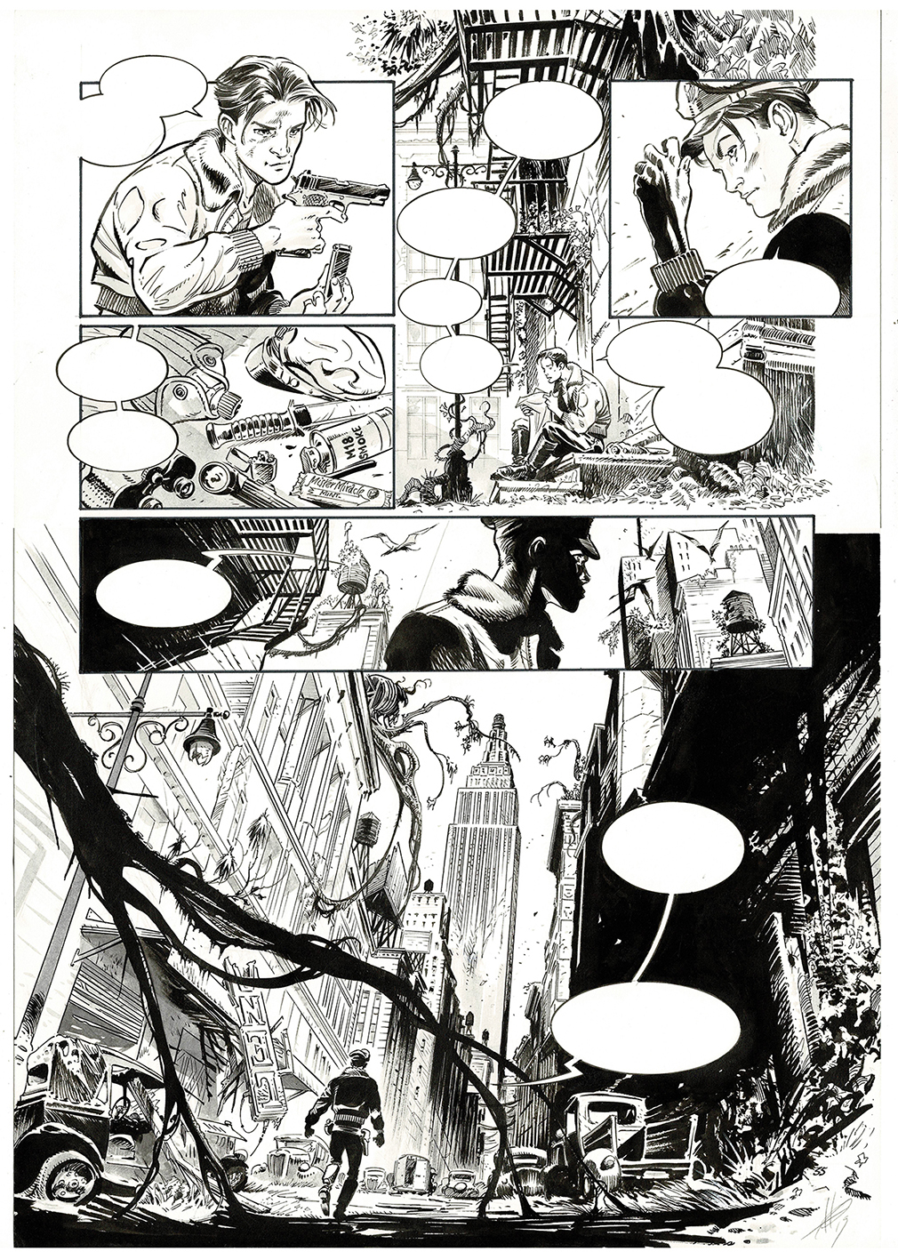 The kong crew, Manhattan jungle, planche originale à l’encre de chine. Dimensions : 51 cm x 35,5 cm.