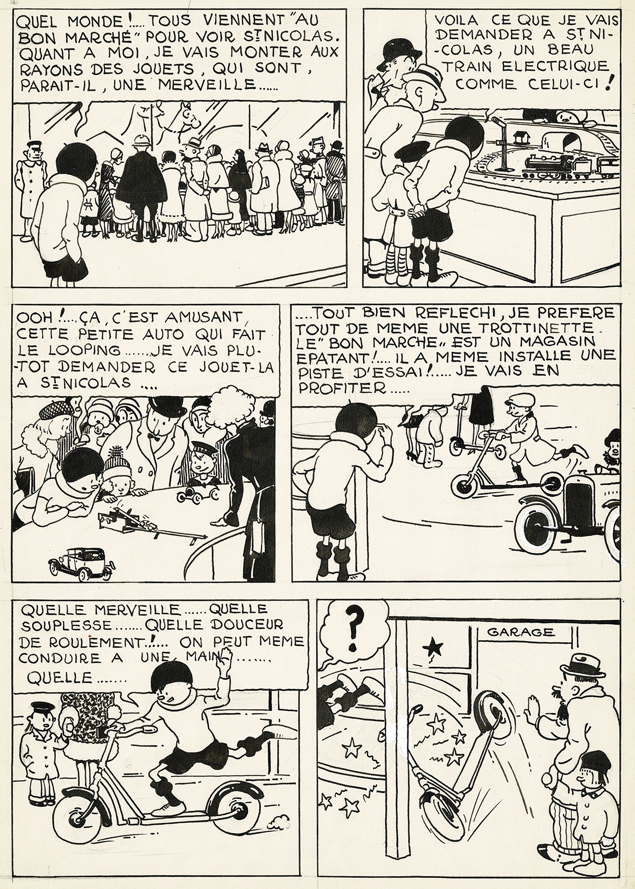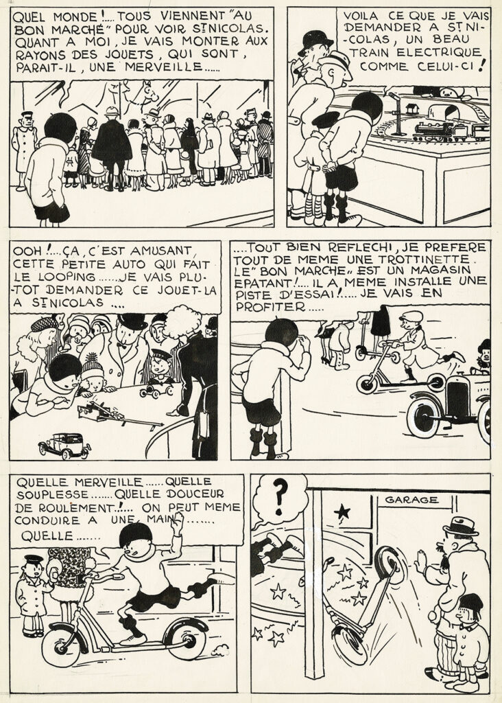 Quick et Flupke, Quick au « Bon Marché » planche originale à l’encre de chine publiée dans le Petit Vingtième n° 47 du 20 novembre 1930 (Numéro spécial de 24 pages à l’occasion de la Saint-Nicolas). Dimensions : 53 cm x 38 cm.
