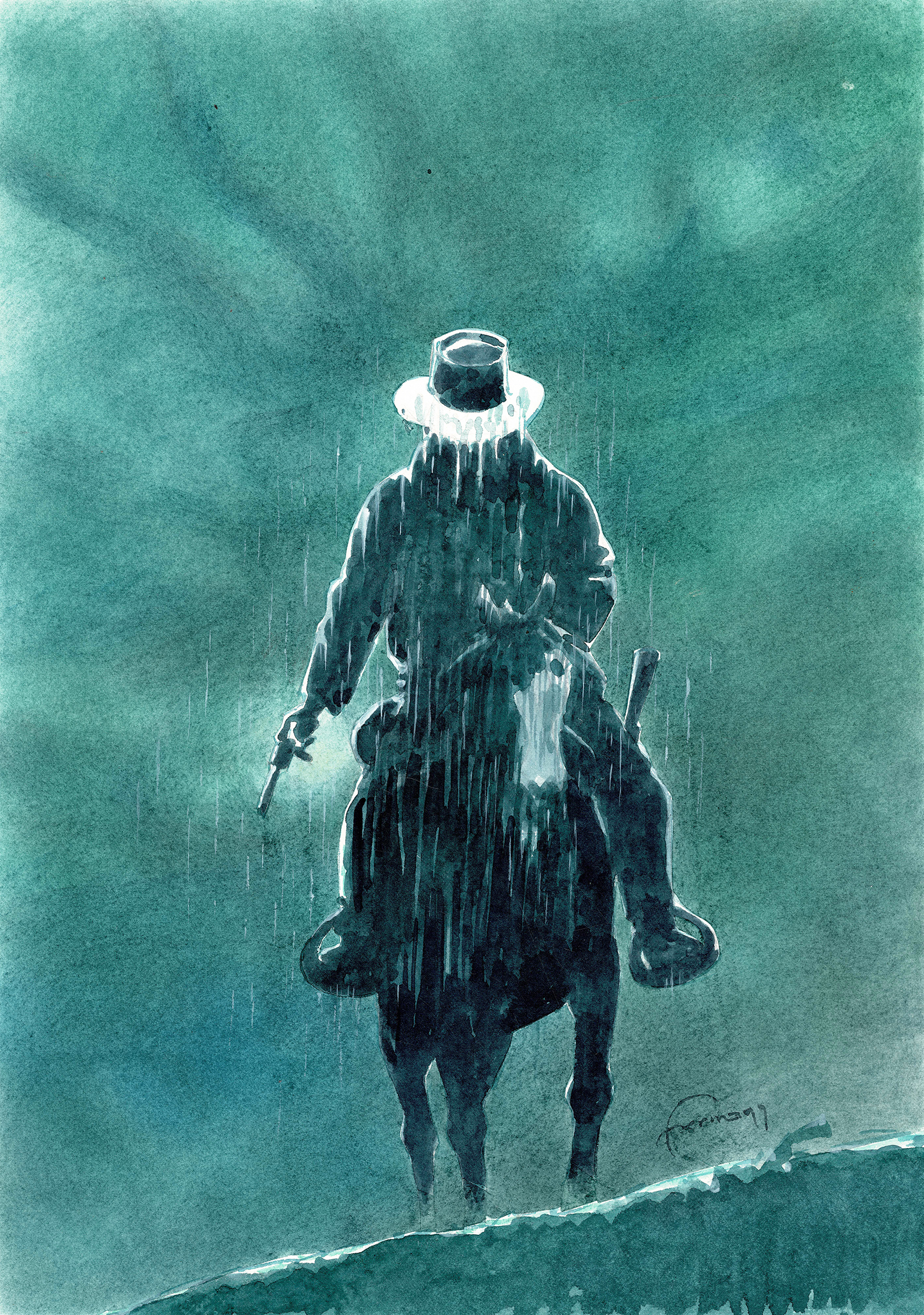 Duke, Je suis une ombre, couverture originale à l’encre de chine et à l’aquarelle pour cet album paru en 2019 au Lombard. Dimensions : 35 cm x 25 cm.