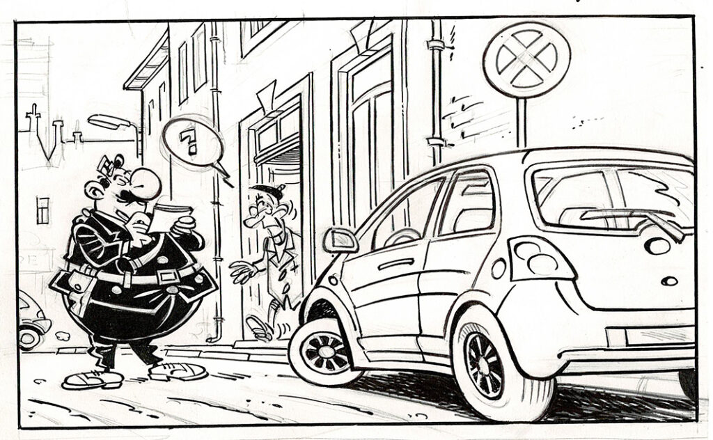 L’agent 212, case originale à l’encre de chine. Dimensions : 17 cm x 13,5 cm.