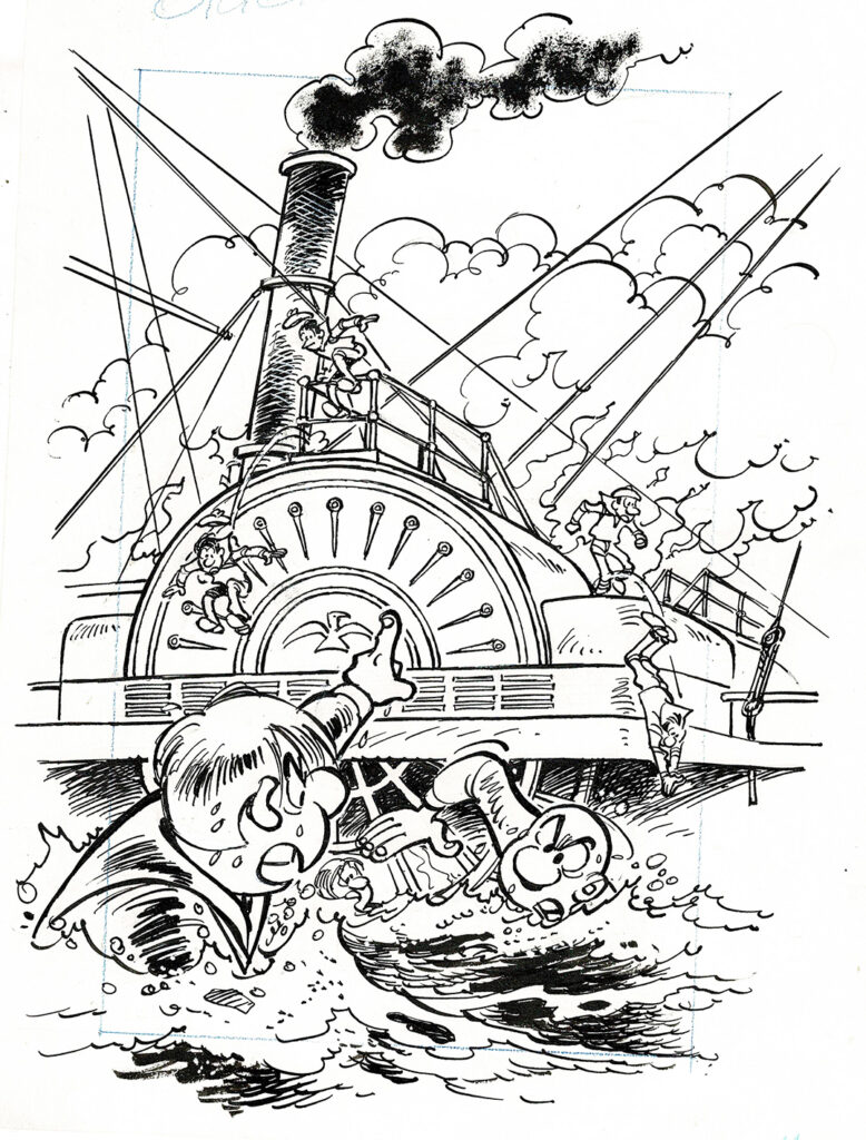 Les Tuniques Bleues, Les bleus de la marine, projet de couverture à l’encre de chine pour le journal Spirou. Dimensions : 26 cm x 19,5 cm.