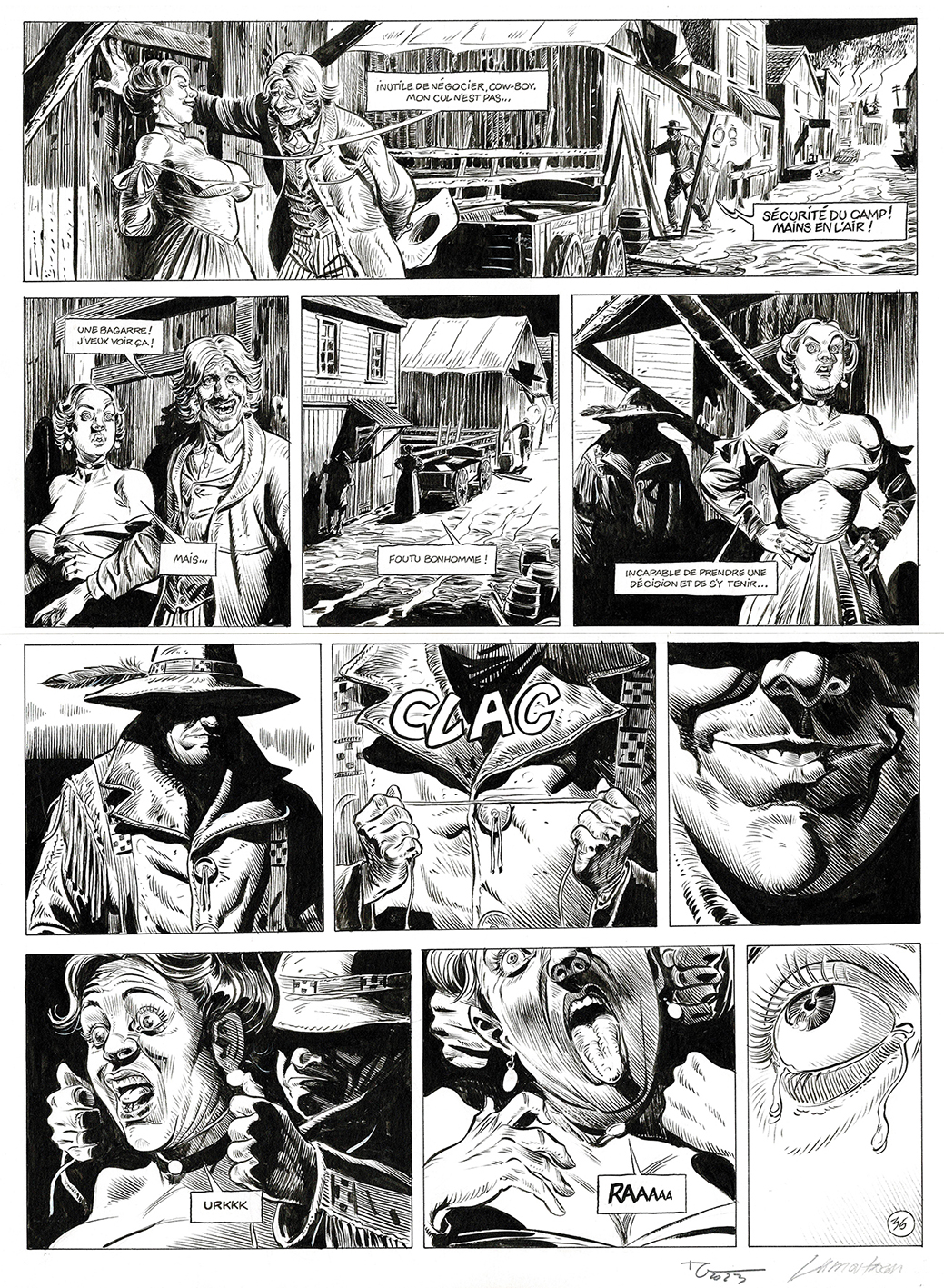 Wild West, Scalps en série, planche originale à l’encre de chine. Dimensions : 51 cm x 41 cm.