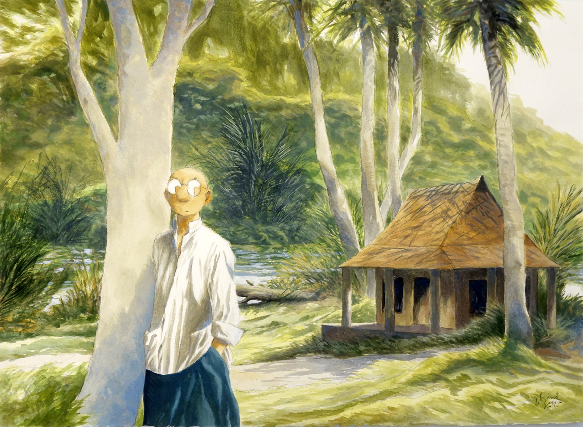 Théodore Poussin, Le costume Malais, illustration originale très grand format à l’acrylique et à la mine de plomb. Dimensions : 76,5 cm x 57 cm.
