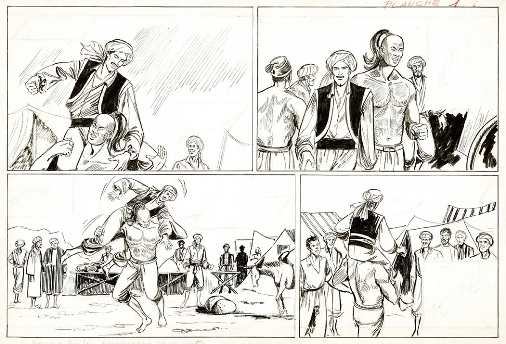 Nasdine Hodja, planche originale à l’encre de chine. Dimensions : 40,5 cm x 27 cm.
