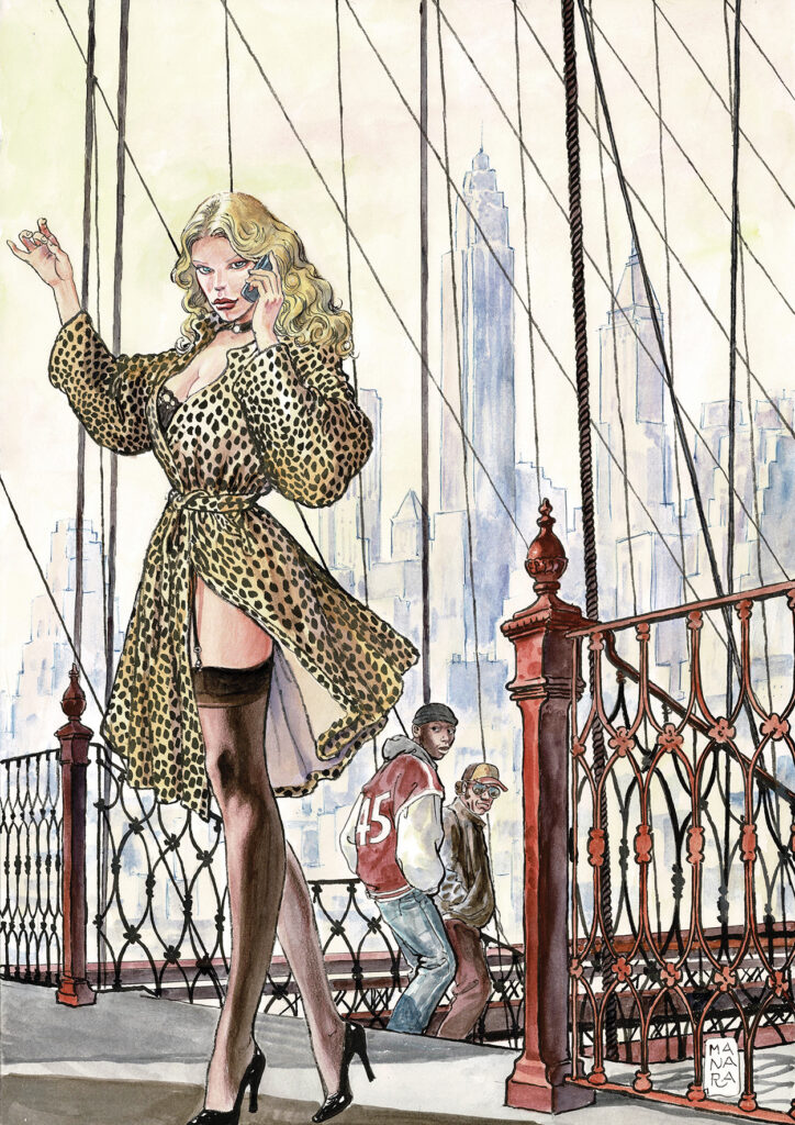 New-York, Le pont de Brooklyn, dessin original à l’encre de chine et à l’aquarelle. Dimensions : 51 cm x 36 cm.