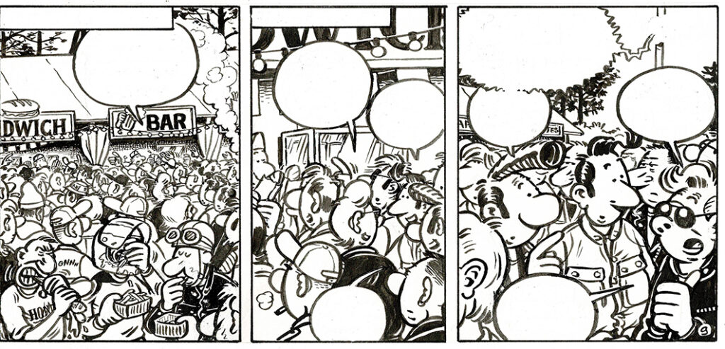 Lucien, Week-end motard, strip original inédit à l’encre de chine. Dimensions : 26 cm x 12 cm.