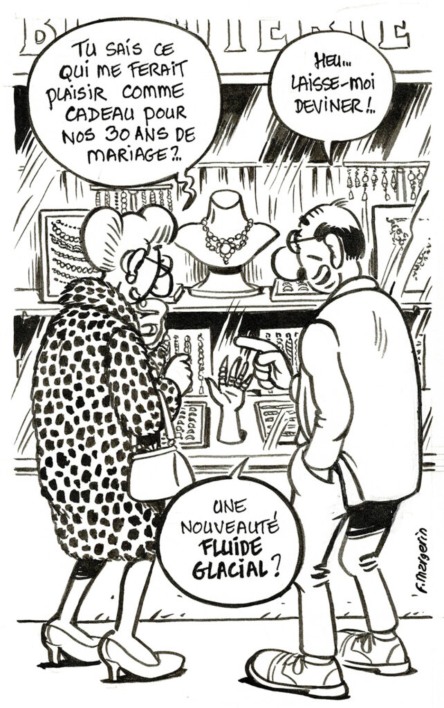Publicité pour les nouveautés dans Fluide Glacial, dessin original à l’encre de chine. Dimensions : 29,5 cm x 20,5 cm.