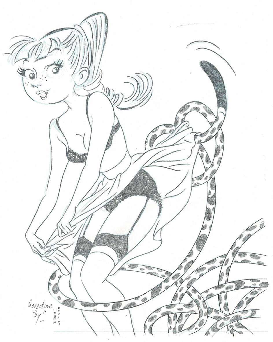 Seccotine et le Marsupilami, dessin original à la mine de plomb en hommage à Franquin. Dimensions : 29,5 cm x 21 cm.