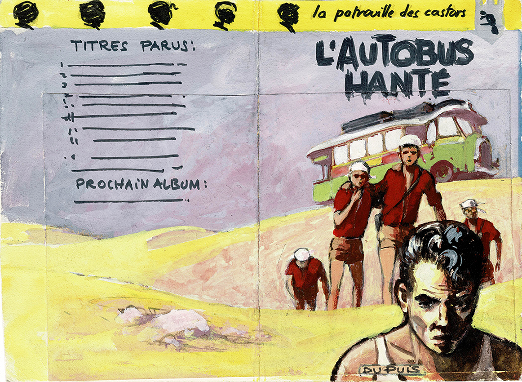 La Patrouille des Castors, L’autobus hanté, projet de couverture original à l’encre de chine et à l’aquarelle pour cet album paru en 1967 chez Dupuis. Dimensions : 17,5 cm x 13 cm.